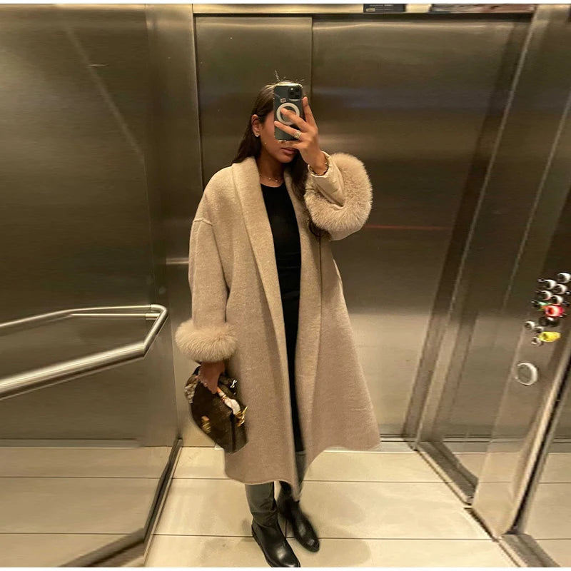 The Cové Aura Wrap is where luxury meets comfort. With its soft apricot hue, plush faux fur trim, and chic belted silhouette, this coat turns every outing into a statement. Effortlessly stylish, perfect for cool autumn days and glamorous winter nights.
